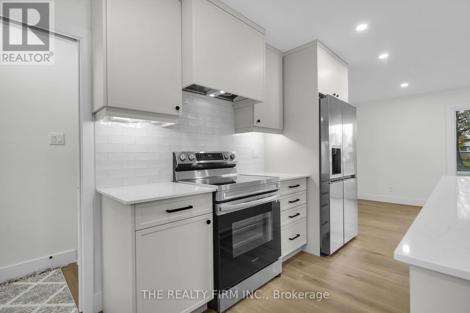 Welcome to 615 Santa Monica, a beautifully renovated Oakridge bungalow offering 4 bedrooms (3 on the main plus 1 in the lower level) and 3 full bathrooms, including a rare 3-piece ensuite. The main floor has engineered hardwood throughout, a brand new kitchen with quartz countertops and backsplash, and fully renovated bathrooms. The fully finished lower level features a spacious rec-room, living room, two new egress windows, a large bedroom, a 4-piece bath, and a bright finished laundry room. Corner lot with single carport and a great backyard for entertaining. Excellent school district with John Dearness Public, St. Nicholas Catholic, STA only a 5 minute walk, and Oakridge Secondary also close by. Available for $3,599.00 per month plus utilities. (id:4555)
