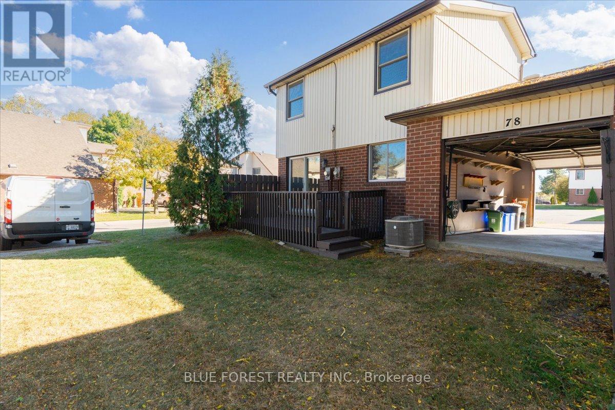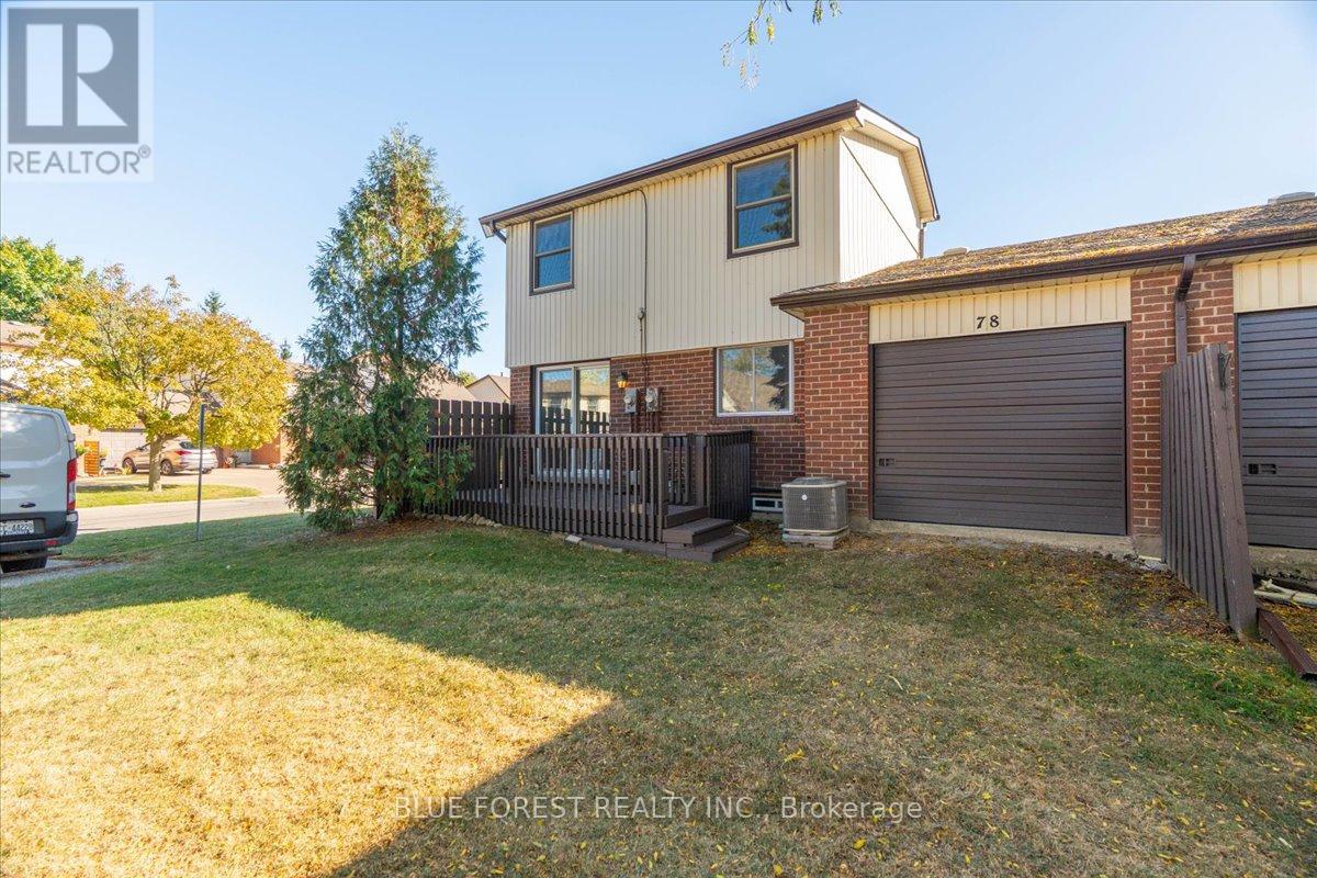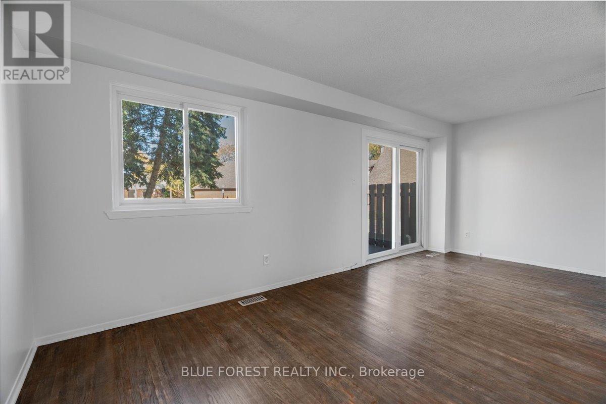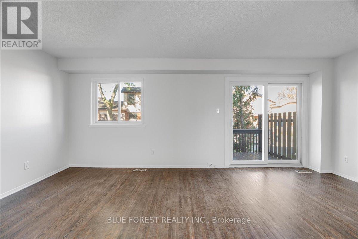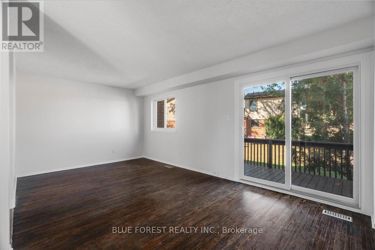 Welcome to this beautifully maintained end-unit condo townhome in the highly desirable South London community-an ideal opportunity for first-time buyers, growing families, or savvy investors. Bright, spacious, and truly move-in ready, this 3-bedroom home offers outstanding value and lifestyle appeal. The main level features updated windows, a new front door with screen, and fresh paint throughout, creating a clean and inviting atmosphere. Rich hardwood flooring flows through the living area and opens onto your private balcony-perfect for morning coffee or evening relaxation. Upstairs, three generous bedrooms provide comfortable space for the whole family. The rare attached tandem garage offers convenient access from the front straight through to the backyard, while the unique layout with garages separating each unit means no shared living walls for added privacy. The finished lower level adds exceptional versatility, ideal for a rec room, home office, gym, or playroom. Recent updates including a newer furnace and A/C (2019) and a freshly re-stained deck offer peace of mind and low-maintenance living. Enjoy the benefits of low condo fees while living in a prime South London location close to Highway 401, shopping, schools, parks, and everyday amenities. (id:4555)
